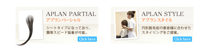 アプランでは突然の発症でお困りの患者様のために、2つの提案をご用意いたしました。まずはヘアスタイルの工夫で隠す方法「APLAN STYLE」、患部には自然で手軽にカバーできる義髪「APLAN PARTIAL」。