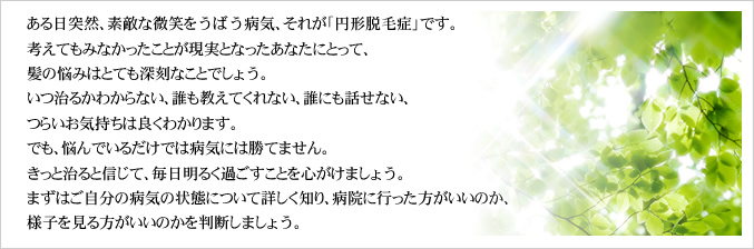 円形脱毛症は、ある日突然、境目のはっきりした脱毛が発生し、拡大していきます。